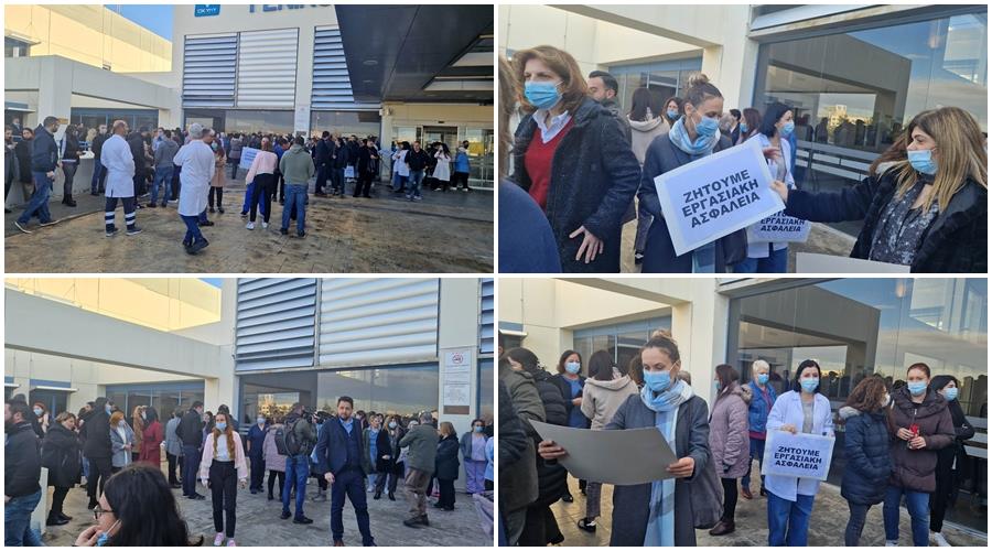 Με πλακάτ ανά χείρας, στα οποία αναγράφεται «ζητούμε εργασιακή ασφάλεια» και «εδώ απεργία», οι εργαζόμενοι στα νοσηλευτήρια σε όλη την Κύπρο άφησαν τα καθήκοντά τους και βγήκαν έξω για να διαμαρτυρηθούν για την κατάσταση που επικρατεί.