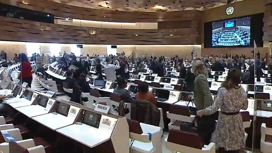 Σε βίντεο που έδωσε στη δημοσιότητα, η μόνιμη αντιπρόσωπος της Αυστρίας στα Ηνωμένα Έθνη και άλλους διεθνείς οργανισμούς στη Γενεύη, Elisabeth Tichy-Fisslberger, δείχνει τη στιγμή που αποχωρούν οι διπλωμάτες από την αίθουσα.