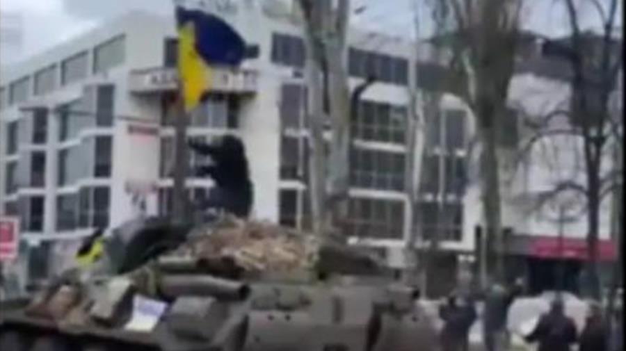 Ουκρανός διαδηλωτής σε ένα άλλο βίντεο έχει σκαρφαλώσει πάνω σε ένα ρωσικό τεθωρακισμένο κυματίζοντας την ουκρανική σημαία. Όσοι παρακολουθούν το σκηνικό, τον αποθεώνουν φωνάζωντας υβριστικά συνθήματα κατά των Ρώσων.