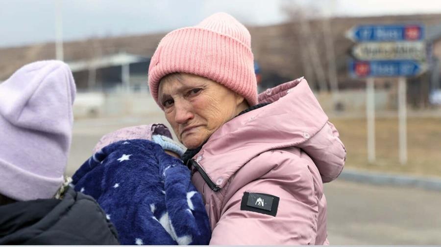 Στην πρώτη φωτογραφία απεικονίζεται μια γιαγιά να μεταφέρει στην αγκαλιά της το εγγόνι της, ενώ προσπαθούν να διαφύγουν από την εμπόλεμη Ουκρανία προς τη Μολδαβία.