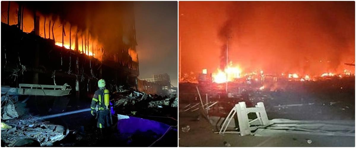 Κατά τη διάρκεια της νύχτας οι υπηρεσίες αντιμετώπισης εκτάκτων καταστάσεων ανέφεραν πως «εχθρικά πυρά» προκάλεσαν πυρκαγιά σε αρκετούς ορόφους του εμπορικού κέντρου στη συνοικία Ποντίλσκι.