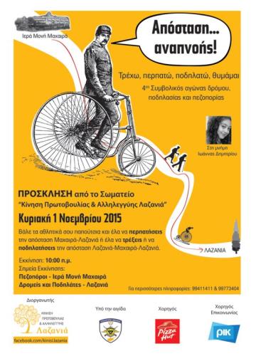 Την Κυριακή 1η Νοεμβρίου, βάλε τα αθλητικά σου παπούτσια, και έλα να περπατήσεις την απόσταση Μαχαιρά-Λαζανιά ή έλα να τρέξεις ή να ποδηλατήσεις την απόσταση Λαζανιά-Μαχαιρά-Λαζανιά.