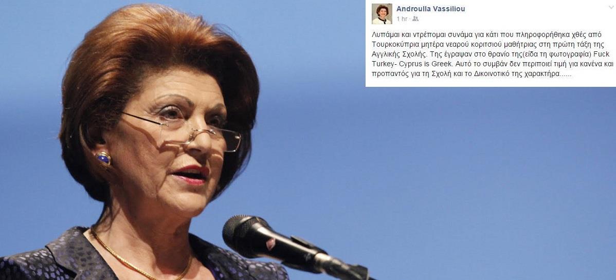 Η πρώην επίτροπος εκπαίδευσης έγραψε το απόγευμα της Τετάρτης (28/10) στον προσωπικό της λογαριασμό «Λυπάμαι και ντρέπομαι συνάμα για κάτι που πληροφορήθηκα χθές από Τουρκοκύπρια μητέρα νεαρού κοριτσιού μαθήτριας στη πρώτη τάξη της Αγγλικής Σχολής. Της έγραψαν στο θρανίο της(είδα τη φωτογραφία) Fuck Turkey- Cyprus is Greek. Αυτό το συμβάν δεν περιποιεί τιμή για κανένα και προπαντός για τη Σχολή και το Δικοινοτικό της χαρακτήρα......»