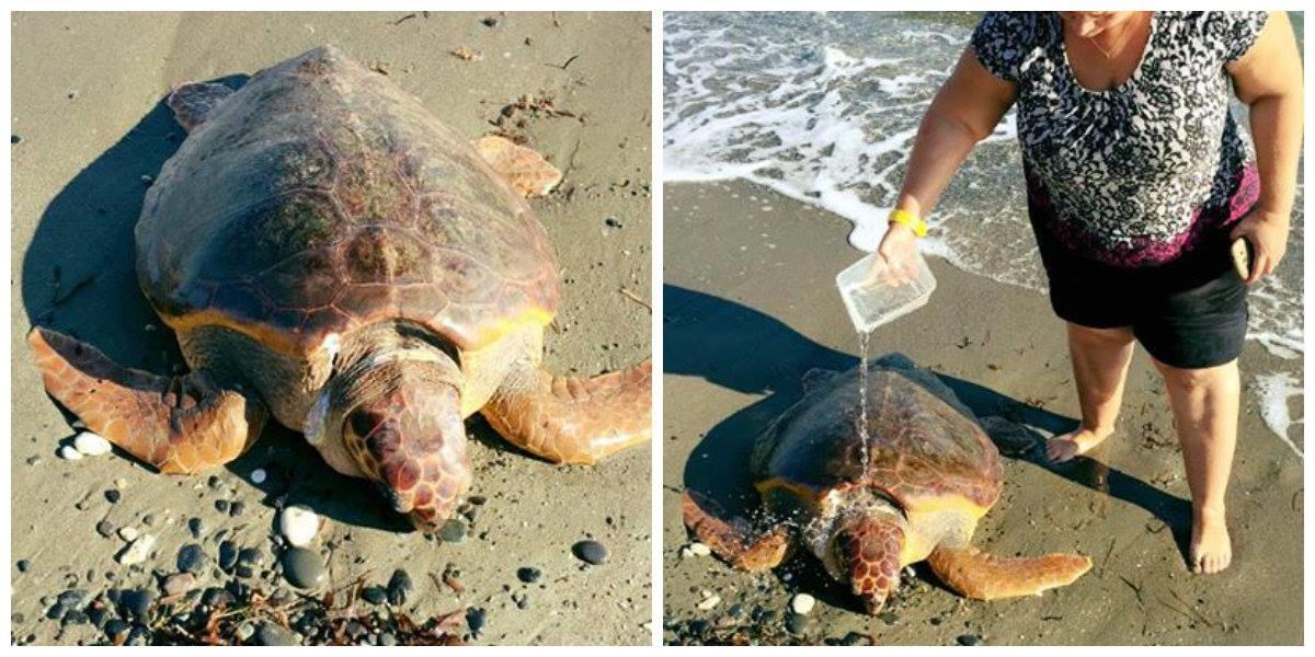 Η χελώνα με την κα Χαραλαμπίδου στο πλευρό της περίμεναν για την βοήθεια των ειδικών που έφτασε μετά από περίπου 3 ώρες.