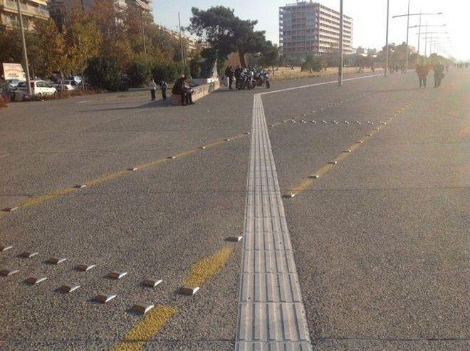 Το έργο, που παραδόθηκε στους πολίτες πριν από δύο χρόνια, προβλέπει μεν διαδρομή για τους τυφλούς, ωστόσο σε κάποιο σημείο, όπως φαίνεται και στη φωτογραφία, αυτή περνάει μέσα από τον ποδηλατόδρομο.