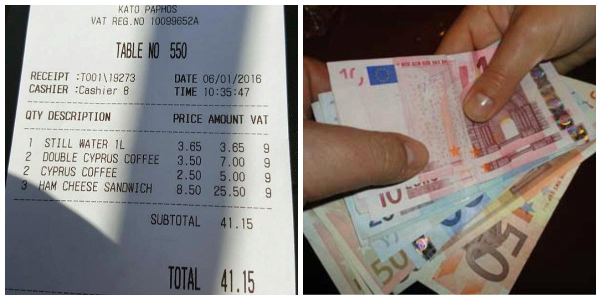 Η συγκεκριμένη απόδειξη, εκδόθηκε χθες από καφεστιατόριο στην Κάτω Πάφο. Όπως βλέπετε, ο πολίτης που την ανάρτησε στο διαδίκτυο, κλήθηκε να πληρώσει για ένα μπουκάλι νερό, 4 κυπριακούς καφέδες (οι 2 διπλοί) και τρία τοστ το ποσό των 41.15 ευρώ!