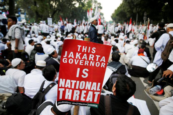 Σκηνές χάους εκτυλίχθηκαν κοντά στο προεδρικό μέγαρο και το δημαρχείο της πόλης, αφού ολοκληρώθηκε η ειρηνική διαδήλωση του Μετώπου Υπερασπιστών του Ισλάμ (FPI). Η οργάνωση αυτή κατηγορεί τον κυβερνήτη της Τζακάρτας, τον "Αχόκ" Μπασούκι Τζαχάτζα Πουρνάμα, ο οποίος είναι χριστιανός κινεζικής καταγωγής, για προσβολή του Ισλάμ.