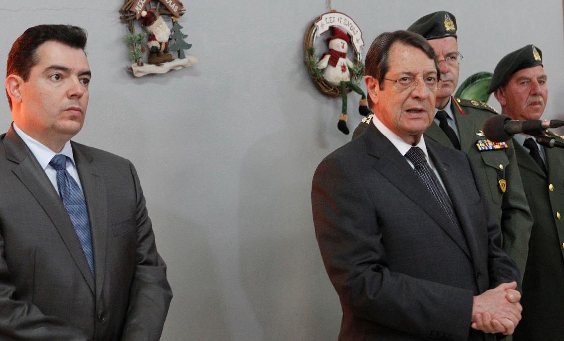 Ο Πρόεδρος Αναστασιάδης μιλούσε σήμερα ενώπιον αξιωματικών, υπαξιωματικών και κληρωτών και συμβασιούχων οπλιτών της ΕΦ αλλά και της ΕΛΔΥΚ, επισκεπτόμενος τα στρατόπεδα «Ανδρέα Ζάκου» και «Ηλία Παπακυριακού» στην Αθαλάσσα με την ευκαιρία των εορτών των Χριστουγέννων και της Πρωτοχρονιάς. Ο Πρόεδρος, συνοδευόμενος από τον Υπουργό Αμυνας, δέχθηκε τιμές και στα δύο στρατόπεδα, από στρατιωτικό άγημα και άκουσε σε σύντομες τελετές, τα χριστουγεννιάτικα κάλαντα και τις ευχές.