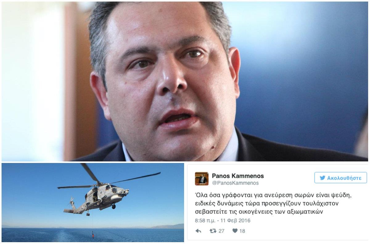 Στην πρώτη του αντίδραση ο Πάνος Καμμένος στον λογαριασμό του στο twitter διέψευσε ότι βρέθηκαν οι σωροί των τριών αξιωματικών.