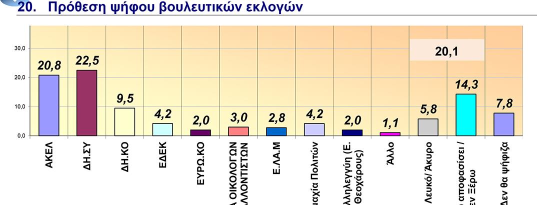 Στην ερώτηση «τι θα ψηφίζατε αν γίνονταν αύριο βουλευτικές εκλογές» ο ΔΗΣΥ διατηρεί την πρωτιά (22,5%), με το ΑΚΕΛ όμως να ακολουθεί στο 20,8% με διαφορά μόλις 1,7%. Το ΔΗΚΟ συγκεντρώνει 9,5%, η ΕΔΕΚ και η Συμμαχία Πολιτών μοιράζονται την τέταρτη θέση με 4,2%, το Κίνημα Οικολόγων εξασφαλίζει 3%, ενώ ακολουθούν το ΕΛΑΜ και το ΕΥΡΩΚΟ με 2,8% και 2% αντίστοιχα. Σημειώνεται ότι η δημοσκόπηση ήταν σε εξέλιξη όταν ανακοινώθηκε η συνεργασία με την Αλληλεγγύη, που στην έρευνα συγκεντρώνει 2%. Ποσοστό 14,3% δηλώνει ότι δεν αποφάσισε, 5,8% δηλώνει ότι επιλέγει λευκό/άκυρο και ποσοστό 7,8% ότι δεν θα ψήφιζε.