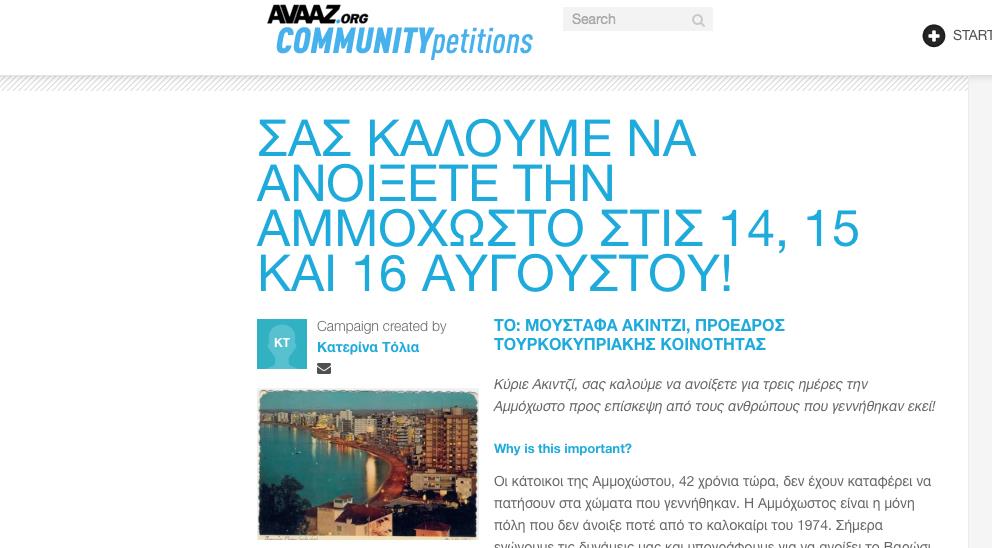 Διαδικτυακή ψηφοφορία ξεκίνησε στη γνωστή φόρμουλα Avaaz, μέσω της οποίας ζητείται από τον Τ/κ ηγέτη Μουσταφά Ακιντζί, το άνοιγμα της Αμμοχώστου για τρεις μέρες και συγκεκριμένα για τις 14, 15 και 16 Αυγούστου, προκειμένου οι άνθρωποι που γεννήθηκαν εκεί, να μπορέσουν να την επισκεφθούν.