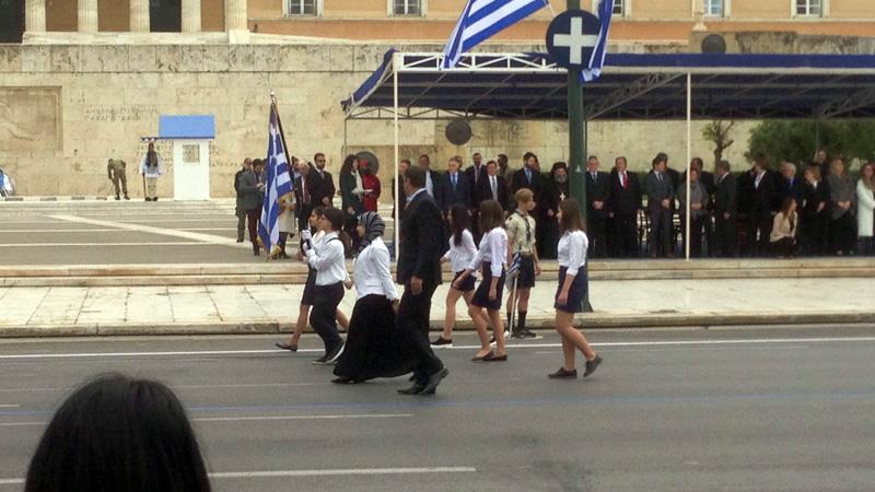 Για ακόμη μια χρονιά, ισχυρές αστυνομικές δυνάμεις βρέθηκαν στην περιοχή, για να διεξαχθεί με ασφάλεια η μαθητική παρέλαση, κάτω από την συννεφιασμένη κατά τα άλλα Αττική.