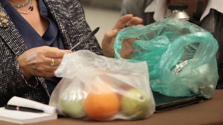 Μια σακούλα με τα φρούτα της πορτοκάλια και αχλάδια απώθεσε η αναπληρωτής υπουργός Θεανώ Φωτίου στο έδρανο της εν αναμονή της ομιλίας του πρωθυπουργού στην Κεντρική Επιτροπή του ΣΥΡΙΖΑ.