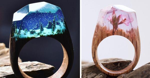 Αυτά τα απόκοσμα δαχτυλίδια είναι η δημιουργία της καναδικής εταιρείας κατασκευής κοσμημάτων Secret Wood. Είναι όλα χειροποίητα, κατασκευασμένα από ξύλο, ρητίνη και κερί μέλισσας. Η βάση του δαχτυλιδιού είναι ξύλινη και επάνω του τοποθετούνται διάφορες παραστάσεις από ρητίνη, οι οποίες αποτυπώνουν διαφορετικούς μικρόκοσμους, που εντυπωσιάζουν τόσο με τα χρώματά τους όσο και με τις λεπτομέρειες στα μοτίβα.