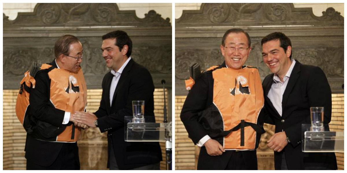 Συνεχίζει σήμερα Σάββατο η επίσκεψη του γγ του ΟΗΕ, Μπαν Κι Μουν στην Αθήνα. Ο Κορεάτης συναντήθηκε το πρωί με τον Έλληνα πρωθυπουργό Αλέξη Τσίπρα και έπειτα από συζήτηση, παρέδωσαν από κοινού συνέντευξη Τύπου στο Μέγαρο Μαξίμου. Ολοκληρώνοντας την ομιλία του ο πρωθυπουργός, θέλησε να "σπάσει το πρωτόκολλο" και να χαρίσει στον εκπρόσωπο του ΟΗΕ ένα συμβολικό δώρο που η εικόνα του συνδέθηκε άμεσα με το προσφυγικό τους τελευταίους μήνες.