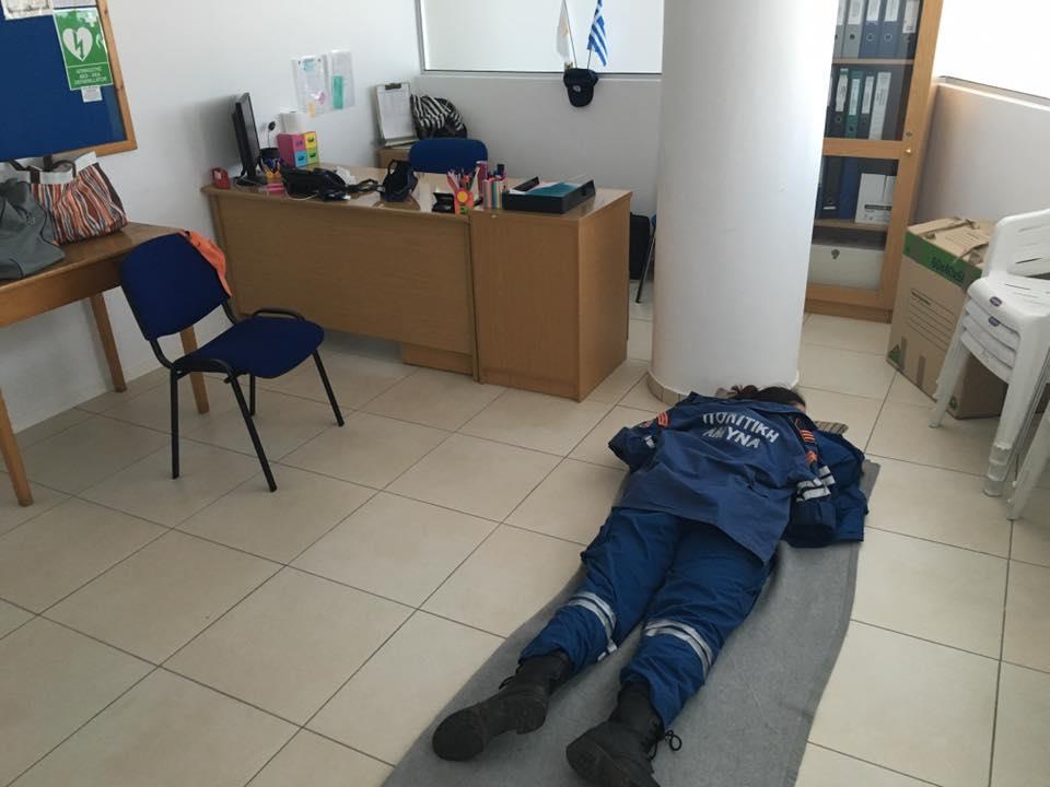 Η εθελόντρια Τμηματάρχης Εκπαιδευτής Πρώτων Βοηθειών Πολιτικής Άμυνας Μαρία Ηρακλεους, «κλέβει» 1 ώρα ύπνου στα πλακάκια του γραφείου της πριν την επόμενη αποστολή.