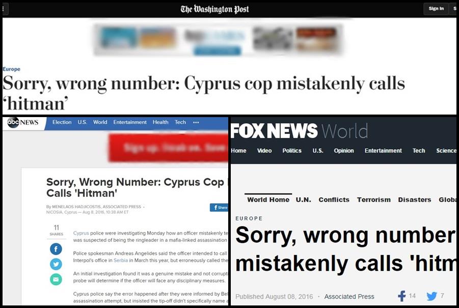 Με τίτλο: «Συγνώμη λάθος αριθμός. Ο Κύπριος αστυνομικός τηλεφώνησε σε δολοφόνο», το θέμα κάνει από χθες τον γύρο ολόκληρου του κόσμου. Ξένα δίκτυα όπως το Fox Νews το ABC, η Washington post καθώς και άλλα πολλά μέσα σε ολόκληρο τον κόσμο ασχολήθηκαν με το θέμα κάνοντας διεθνώς ρεζίλι τις κυπριακές αρχές.