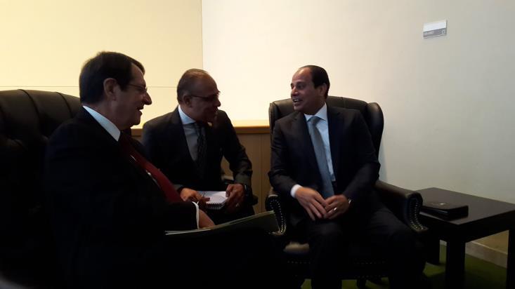 Η τριμερής συνάντηση κορυφής του Καϊρου, οι διμερείς σχέσεις των δύο χωρών, το Κυπριακό και οι εξελίξεις στην περιοχή, ήταν στην ατζέντα της σημερινής συνάντησης του Προέδρου Αναστασιάδη και του Αιγύπτιου ομολόγου του, που διεξήχθη σε θερμό και φιλικό κλίμα στο περιθώριο της Γενικής Συνέλευσης του ΟΗΕ.