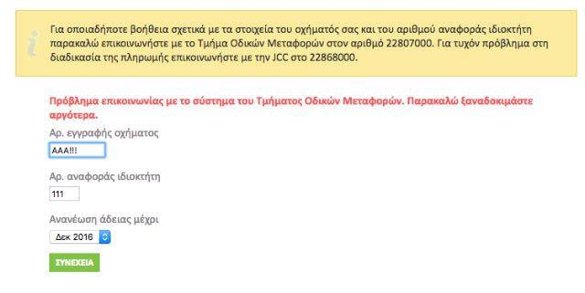 Λόγω του φόρτου που παρατηρήθηκε τις τελευταίες ώρες, η JCC δεν μπορεί να εξυπηρετήσει τους ιδιοκτήτες αυτοκινήτων που θέλουν να πληρώσουν πριν μπει η 9η Σεπτεμβρίου και μαζί της το πρόστιμο για μη ανανέωση των αδειών. Όσοι δεν ανανεώσουν τις άδειες κυκλοφορίας θα κληθούν να καταβάλουν εξώδικο πρόστιμο 80 ευρώ και επιβάρυνση 10 ευρώ, συν 10%.