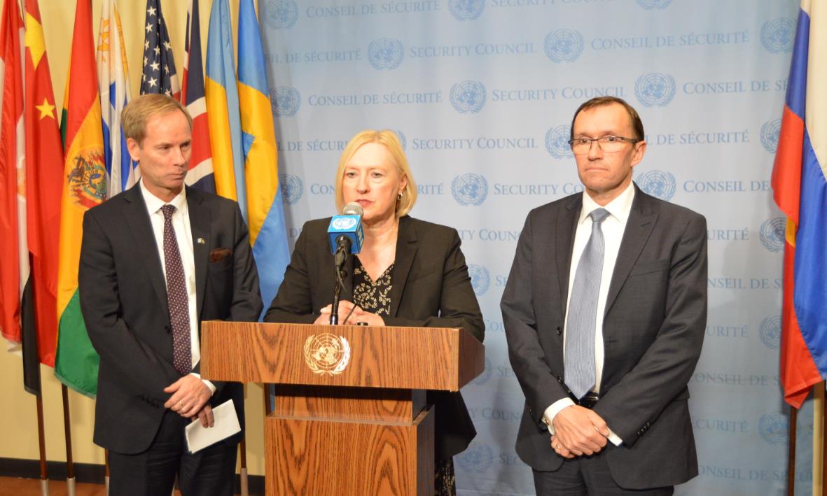 Με κοινή εμφάνιση ενώπιον των δημοσιογράφων, του Σουηδού προέδρου του Συμβουλίου Ασφαλείας, Όλαφ Σκοογκ (Olof Skoog), του ειδικού συμβούλου του ΓΓ του ΟΗΕ για το Κυπριακό Έσπεν Μπαρθ Έιντε και της ειδικής αντιπροσώπου του στην Κύπρο Ελίζαμπεθ, Σπέχαρ, ολοκληρώθηκε η ενημέρωση των μελών του Συμβουλίου από τους δύο αξιωματούχους του ΟΗΕ, για τις τελευταίες εξελίξεις στο Κυπριακό, συμπεριλαμβανομένων και των συναντήσεων της Γενεύης και της Διάσκεψης για την Κύπρο.