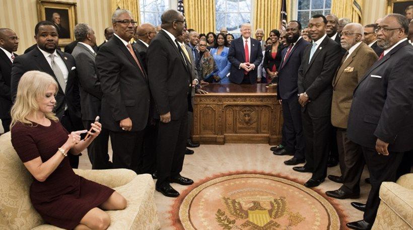 Μια τέτοια αφορμή αποτέλεσε και η συμπεριφορά της συμβούλου του αμερικανού προέδρου Κέλιαν Κόνγουεϊ, την οποία ο φωτογραφικός φακός απαθανάτισε να κάθεται με τα πόδια - αλλά χωρίς παπούτσια - πάνω στον καναπέ του Οβάλ Γραφείου ενώ ο Τραμπ συναντάται με αφροαμερικανούς πρυτάνεις πανεπιστημίων.