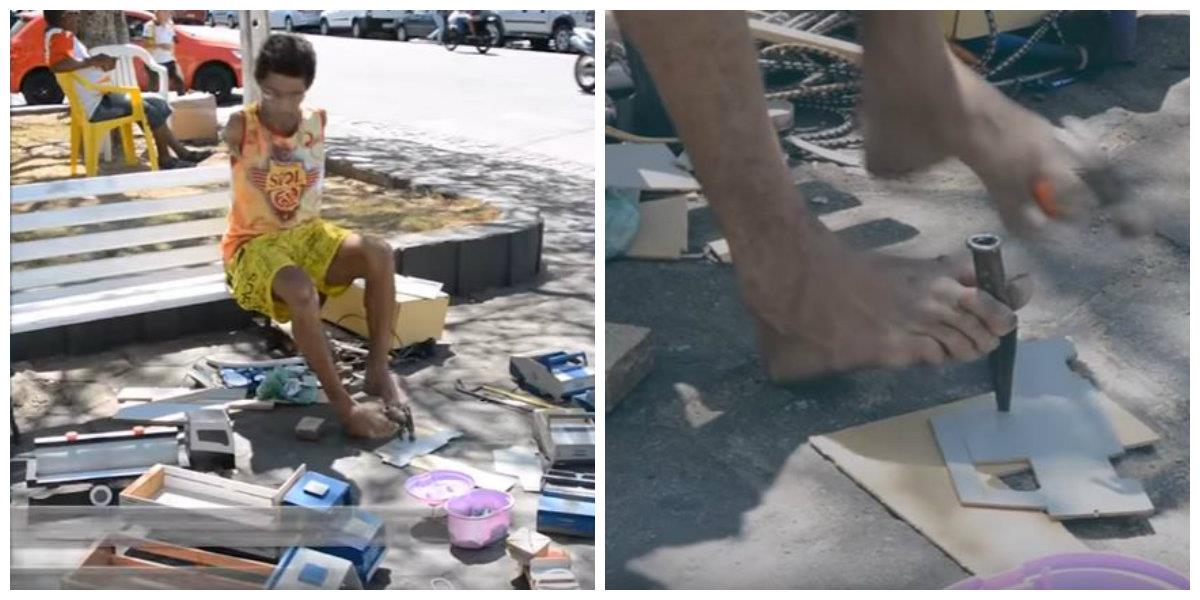 Βλέποντας το βίντεο που κάνει τις τελευταίες ώρες το γύρο του διαδικτύου, διαπιστώνει πως τα πόδια του αντικατέστησαν τα χέρια του και με τη βοήθειά τους δημιουργεί εξαιρετικές κατασκευές.