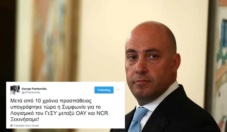 «Μετά από 10 χρόνια προσπάθειας υπογράφτηκε τώρα η Συμφωνία για το Λογισμικό του ΓεΣΥ μεταξύ ΟΑΥ και NCR. Ξεκινήσαμε!», έγραψε στο Twitter ο κ. Παμπορίδης. Σε άλλη ανάρτηση ο κ. Παμπορίδης πρόσθεσε: «Τέλος με τα ψεύτικα τα λόγια τα μεγάλα για ΓεΣΥ. Από σήμερα μιλούν μόνο οι πράξεις. Αναμένω από τα Κόμματα να κάνουν αυτό που τους αναλογεί».