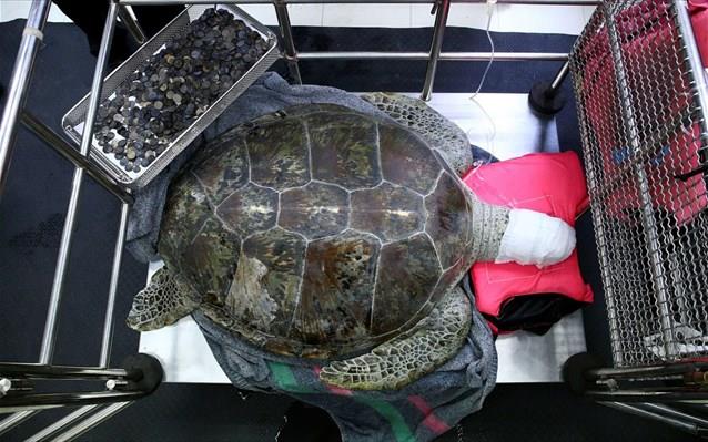 Βλέποντας τη χελώνα να δυσκολεύεται να κινηθεί, οι υπεύθυνοι του κέντρου προστασίας τη μετέφεραν σε κτηνιατρείο, όπου διαπιστώθηκε ότι το ερπετό είχε καταπιεί… 915 νομίσματα.