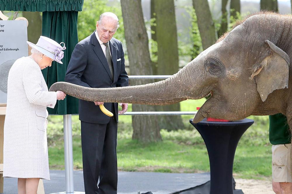 Η Ελισάβετ, που είναι χορηγός της Ζωολογικής Εταιρείας του Λονδίνου, και ο Φίλιππος συναντήθηκαν με τη Ντόνα, έναν από τους εννέα ασιατικούς ελέφαντες που φιλοξενούνται στο Κέντρο Φροντίδας Ελεφάντων στον ζωολογικό κήπο ZSL Whipsnade Zoo, στα περίχωρα του Λονδίνου.