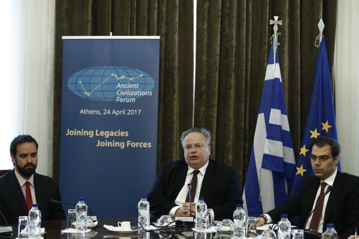Με πρωτοβουλία του Ελληνα Υπουργού Εξωτερικών Νίκου Κοτζιά συνέρχεται την Δευτέρα 24 Απριλίου στην Αθήνα το Φόρουμ των Αρχαίων Πολιτισμών (Ancient Civilizations Forum),με την συμμετοχή των ομολόγων του της Κίνας, της Ινδίας, του Ιράκ, του Ιράν, της Αιγύπτου, της Ιταλίας, του Μεξικού, του Περού και της Βολιβίας, « κρατών με σπουδαίο ιστορικό πολιτισμό, που εξακολουθεί να είναι επίκαιρος σήμερα και να επηρεάζει την ανθρωπότητα, αποτελώντας μορφή ήπιας ισχύος, αλλά και οικονομική δύναμη», όπως δήλωσε ο κ.  Κοτζιάς.