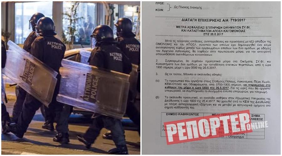 Συγκεκριμένα με εγκύκλιο που μοιράστηκε σε μέλη της δύναμης αναφέρεται ότι «μετά τις τελευταίες επιθέσεις, αντιπαραθέσεις και προκλήσεις μεταξύ οπαδών της Ομόνοιας και του ΑΠΟΕΛ, συνεπεία των οποίων έχει δημιουργηθεί ένα κλίμα αντιπαλότητας, κυρίως μεταξύ των οργανωμένων οπαδών των δύο ομάδων, με οδηγίες του Αρχηγού Αστυνομίας θα ληφθούν στην πρωτεύουσα μέτρα για την αποτροπή οποιονδήποτε ανεπιθύμητων καταστάσεων».