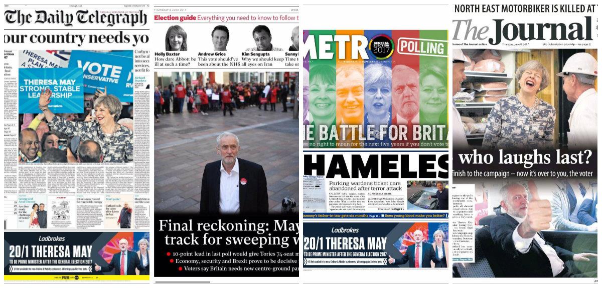 Η "Daily Telegraph" με τίτλο τα ίδια τα λόγια της Μέι: «Η χώρα σε χρειάζεται» κάνει εκτενή αναφορά στην τελευταία προεκλογική παρουσία της ηγέτιδος των Συντηρητικών, κατά την οποία απευθυνόμενη στους «πατριώτες» υποστηρικτές του Εργατικού Κόμματος, τους καλεί να αλλάξουν στρατόπεδο και να την υποστηρίξουν. «Αν πιστεύετε στη Βρετανία στηρίξτε με», είπε χαρακτηριστικά.
