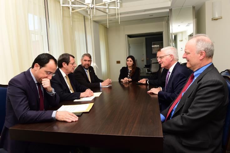 Σύμφωνα με ανακοίνωση της Προεδρίας της Δημοκρατίας, στη συνάντηση συμμετείχαν ο Κυβερνητικός Εκπρόσωπος Νίκος Χριστοδουλίδης, ο Πρέσβης της Δημοκρατίας στις ΗΠΑ Λεωνίδας Παντελίδης και υπηρεσιακοί παράγοντες.