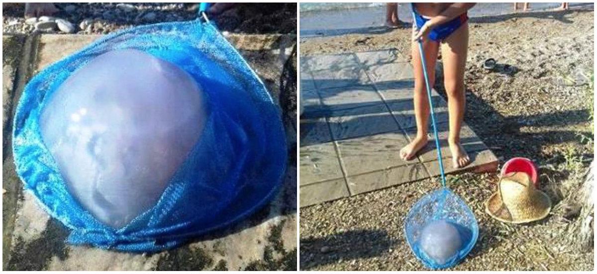 Στην παραλία Άκολης τις περασμένες μέρες, ο εικονιζόμενος νεαρός φίλος του filodimos.gr Κοσμάς "ψάρεψε" μια τεράστια μέδουσα βάρους 4-5 κιλών (φωτό).