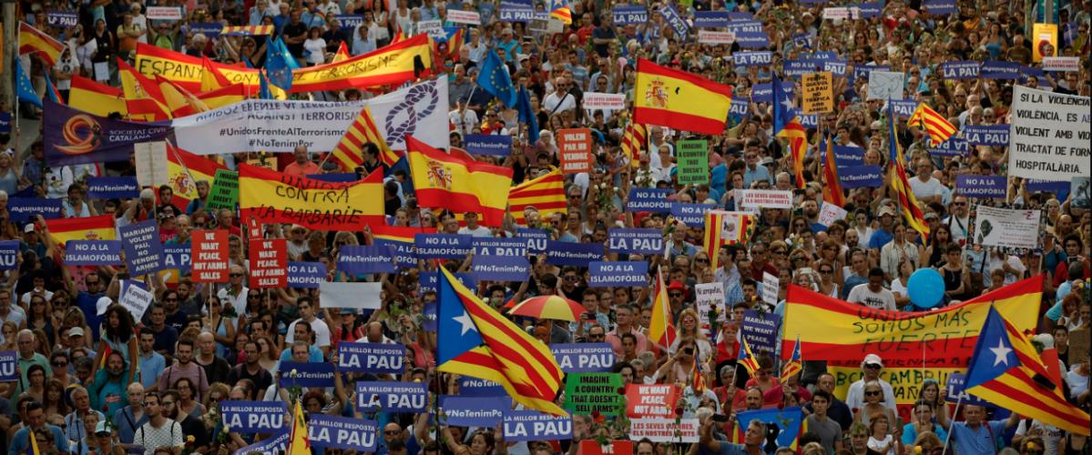 "Η καλύτερη απάντηση: η ειρήνη" και "Όχι στην ισλαμοφοβία" έγραφαν τα πλακάτ που κρατούσαν πολλοί συγκεντρωμένοι. Άλλοι διαδηλωτές είχαν υψώσει καταλανικές σημαίες.
