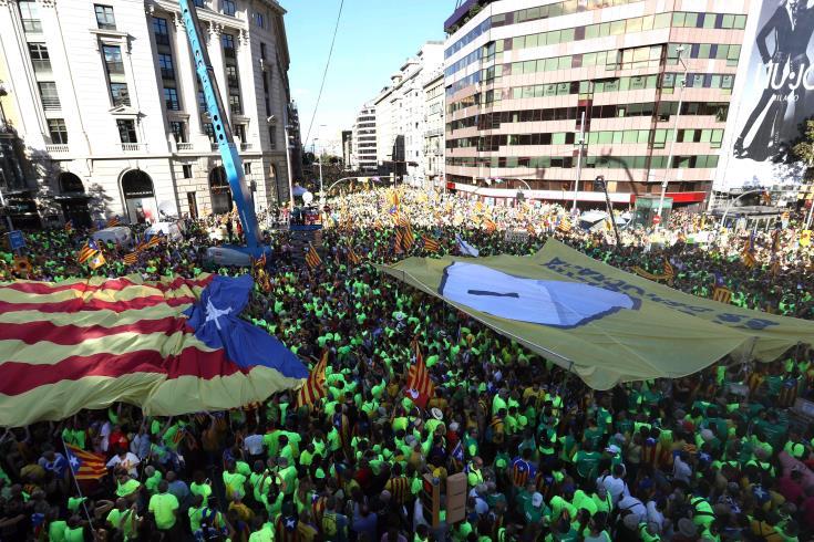 Οι εικόνες που τραβήχτηκαν από ελικόπτερα έδειχναν τους δρόμους της πόλης να έχουν κατακλυστεί από κόσμο. Δεκάδες χιλιάδες άνθρωποι, με υψωμένες τις σημαίες της ανεξαρτησίας, θα σχηματίσουν στο κέντρο της Βαρκελώνης έναν τεράστιο σταυρό, μήκους ενός χιλιομέτρου: ο σταυρός αυτός συμβολίζει το "X", που σκοπεύουν να γράψουν στο κουτάκι του "ναι" στα ψηφοδέλτια, την 1η Οκτωβρίου.