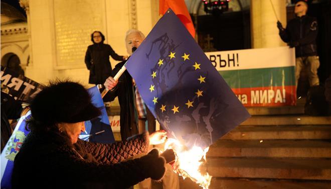 Ομάδα πολιτών που διαδήλωνε κατά του ΝΑΤΟ και της ΕΕ συγκεντρώθηκε για να κάψει τη σημαία και των δύο αυτών θεσμών, με σύνθημα «Έξω το ΝΑΤΟ», κάτι το οποίο ζητεί μια πολύ μικρή μερίδα πολιτών στη Βουλγαρία που είναι μια από τις πιο φιλοευρωπαϊκές χώρες.