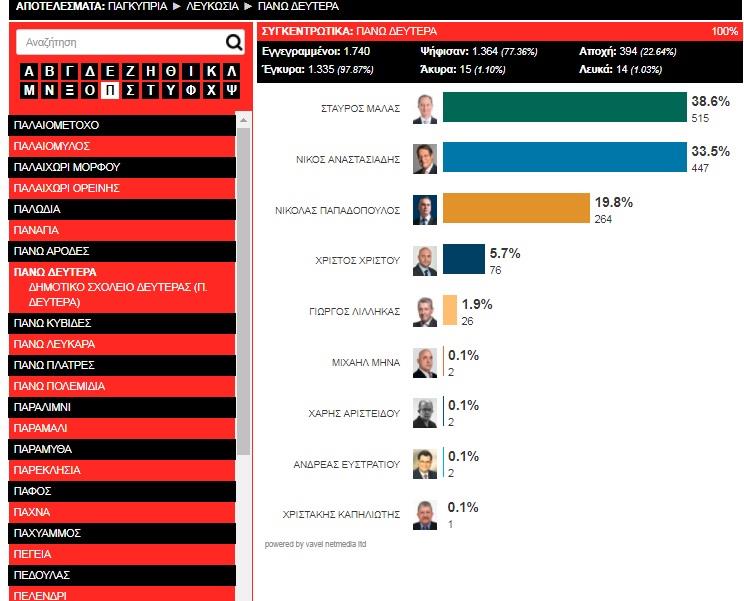 Σύμφωνα με τα αποτελέσματα, οι κάτοικοι της Δευτεράς, οι περισσότεροι ψήφισαν Σταύρο Μαλά ο οποίος πήρε ποσοστό 38,6% ενώ ακολουθεί ο Νίκος