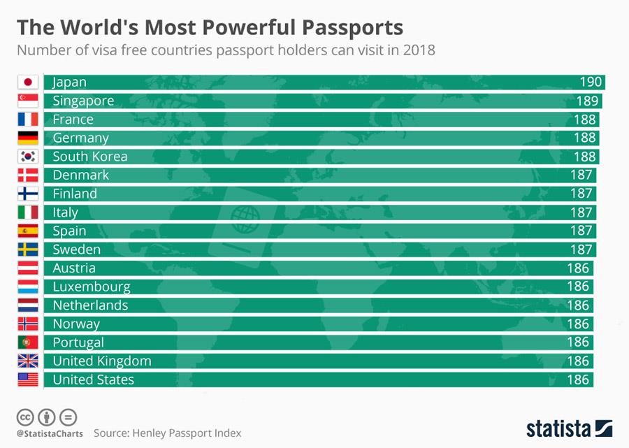 Ορισμένα διαβατήρια παρέχουν στους κατόχους τους περισσότερη ελευθερία από άλλους και αυτή την εβδομάδα η Ιαπωνία ονομάστηκε η χώρα με το πιο ισχυρό διαβατήριο στον κόσμο από τον δείκτη Henley Passport. Στις αρχές του τρέχοντος μηνός, η Μυανμάρ χορήγησε στους Ιάπωνες πολίτες πρόσβαση χωρίς θεώρηση εισόδου, που σημαίνει ότι οι κάτοχοι διαβατηρίων θεωρούν ότι οι κάτοχοι διαβατηρίων έχουν πρόσβαση χωρίς θεώρηση ή πρόσβαση σε άδειες εισόδου σε 190 χώρες. Ένα άλλο νησιωτικό έθνος στην Ασία, η Σιγκαπούρη, βρίσκεται στη δεύτερη θέση με 189 προορισμούς. Η Γαλλία, η Γερμανία και η Νότια Κορέα ακολουθούν όλα τα ταξίδια χωρίς θεώρηση σε 188 δικαιοδοσίες.