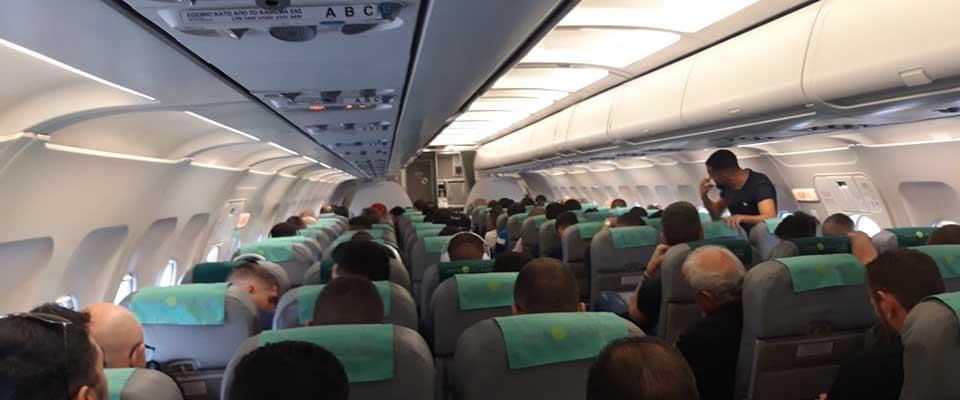 Οι περίπου 70 οπαδοί, που ταξίδεψαν με το αεροπλάνο της αποστολής, χειροκροτούσαν και κάποιοι τραγουδούσαν τον ύμνο.