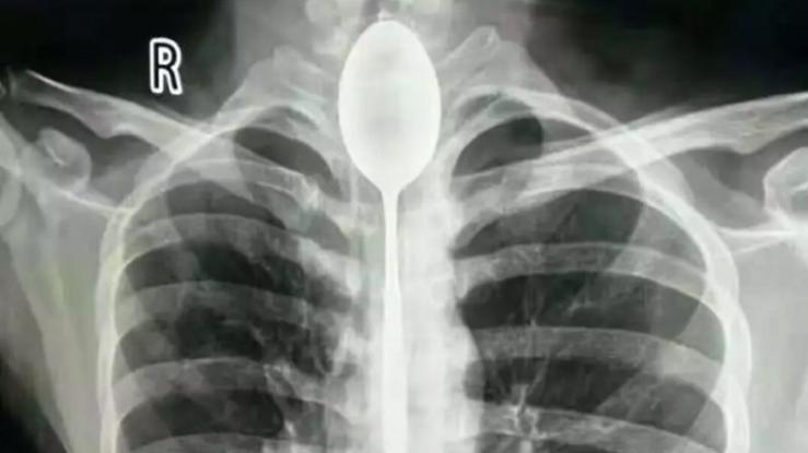 Έφτασε στο νοσοκομείο με δυσκολία στην αναπνοή. Ίσα που ανέπνεε, οι γιατροί του έκαναν ακτινογραφία και δεν πίστευαν στα μάτια τους αυτό που έβλεπαν. Το κουτάλι ήταν ακόμη σφηνωμένο στο λαιμό του και εμπόδιζε την αναπνοή του.