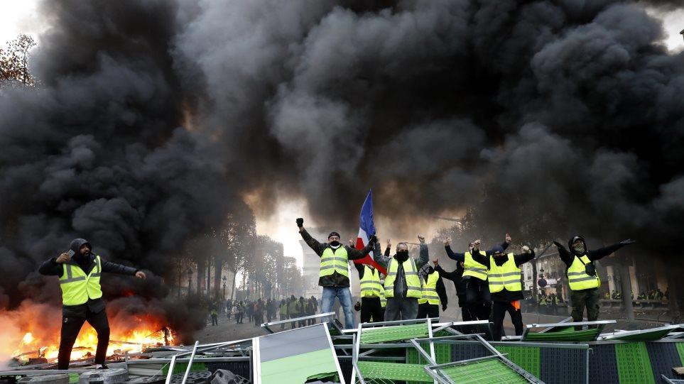 Ξύλο, φωτιές, μπλόκα, άγριες συμπλοκές... Ένα σκηνικό που θύμιζε έντονα πεδίο μάχης εκτυλίχθηκε μπροστά από την Αψίδα του Θριάμβου στο κέντρο του Παρισιού, καθώς χιλιάδες «κίτρινα γιλέκα» βγήλαν στους δρόμους να διαδηλώσουν κατά της πολιτικής Μακρόν, με αφορμή την αύξηση στην τιμή της βενζίνης.
