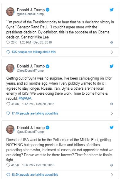 Με μια σειρά αναρτήσεων στο Twitter, o Τραμπ είπε πως εκπληρώνει μια υπόσχεση της προεκλογικής εκστρατείας του το 2016 να εγκαταλείψει την περιοχή της Μέσης Ανατολής. Οι Ηνωμένες Πολιτείες έκαναν τη δουλειά άλλων χωρών, περιλαμβανομένης της Ρωσίας και του Ιράν, με ελάχιστα ως αντάλλαγμα και είναι «καιρός για άλλους να πολεμήσουν τελικά», έγραψε.