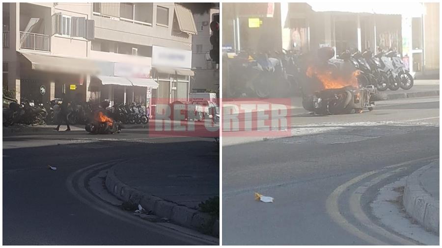 Η μοτοσικλέτα τυλίχθηκε στις φλόγες κάτω από αδιευκρίνιστες συνθήκες κι ενώ σε αυτή επέβαινε ο οδηγός της στη διασταύρωση Μάρκου Δράκου με Τζων Κένεντυ.