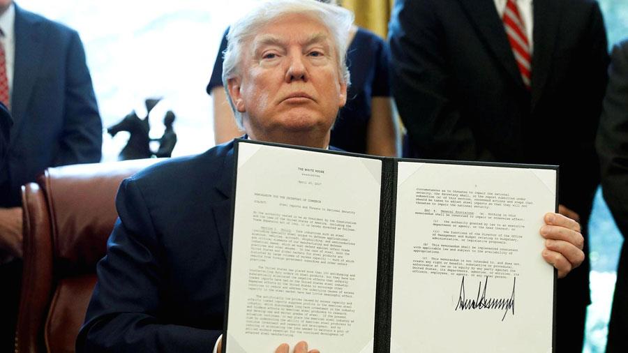 Ο Αμερικανός πρόεδρος Ντόναλντ Τραμπ υπέγραψε το έγγραφο για την επιβολή δασμών 25% στον εισαγόμενο χάλυβα και 10% στο εισαγόμενο αλουμίνιο, απαλλάσσοντας ωστόσο τον Καναδά και το Μεξικό, υπαναχωρώντας από τις πρωτύτερες δεσμεύσεις του για επιβολή δασμών σε όλες τις χώρες.
