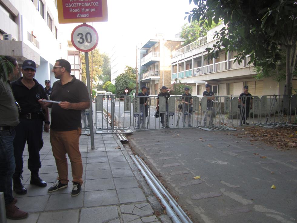 Γύρω από την ισραηλινή Πρεσβεία υπήρχε έντονη και διακριτική παρουσία της Αστυνομίας και ο δρόμος μπροστά από την Πρεσβεία αποκόπηκε για την κυκλοφορία και είχε στηθεί οδόφραγμα.