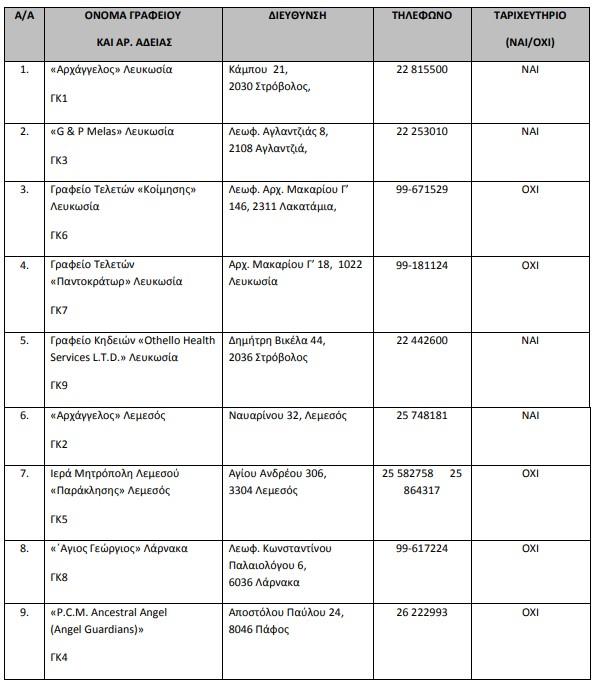 Συγκεκριμένα το Υπουργείο Εσωτερικών κοινοποίησε σχετική λίστα με τα 9 γραφεία τα οποία κατέχουν όλες τις απαραίτητες άδειες για τέλεσε κηδειών την ίδια ώρα που ενημερώθηκαν σχετικά όλες οι εμπλεκόμενες υπηρεσίες του κράτους, η εκκλησία, καθώς και οι ιδιωτικοί φορείς.