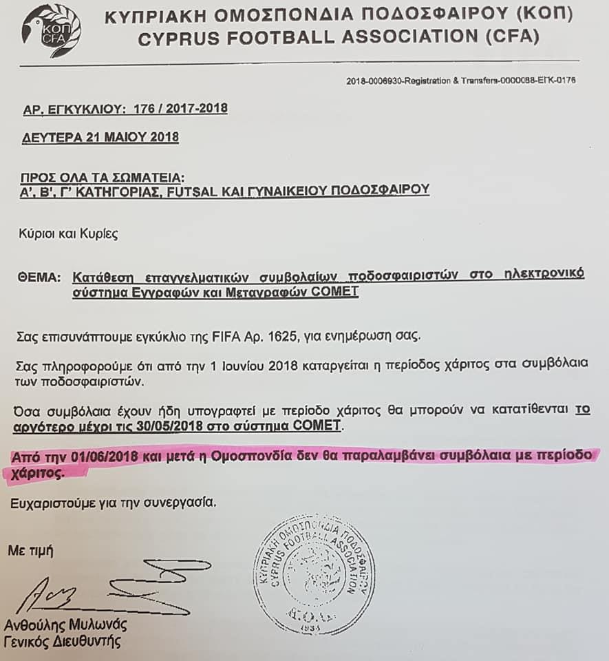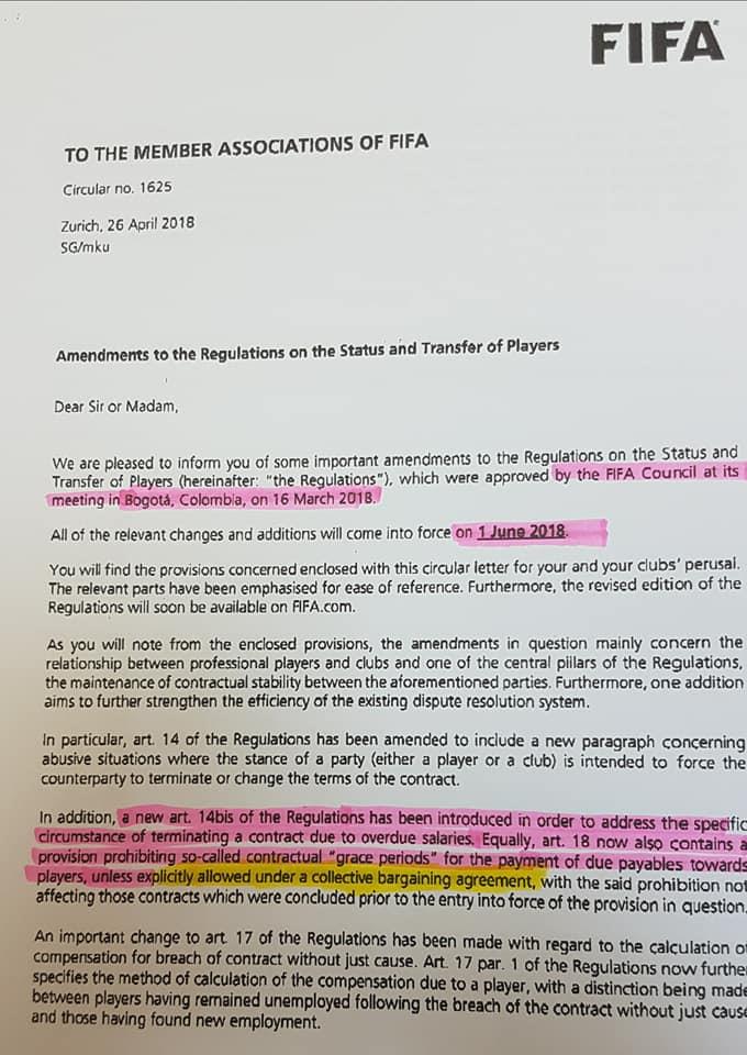 Όπως αναφέρει η περίοδος χάριτος στα συμβόλαια των ποδοσφαιριστών ολοκληρώνεται την 1η Ιούνιου, με τις ομάδες πλέον να μην έχουν δικαίωμα καθυστέρησης στις πληρωμές.