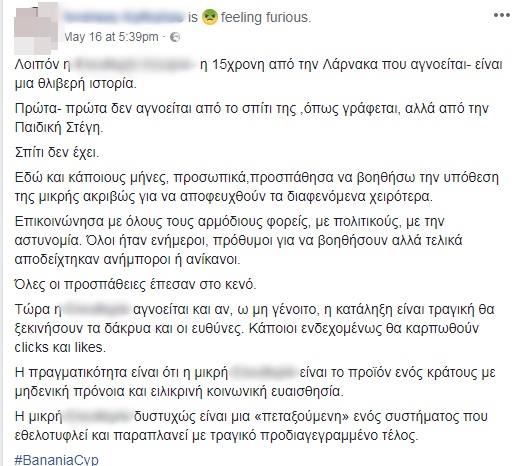 Συγκεκριμένα πολίτης σε ανάρτηση του σε μέσο κοινωνικής δικτύωσης αναφέρει : «Λοιπόν η Ε.Κ.- η 15χρονη από την Λάρνακα που αγνοείται- είναι μια θλιβερή ιστορία .Πρώτα- πρώτα δεν αγνοείται από το σπίτι της ,όπως γράφεται, αλλά από την Παιδική Στέγη. Σπίτι δεν έχει. Εδώ και κάποιους μήνες, προσωπικά, προσπάθησα να βοηθήσω την υπόθεση της μικρής ακριβώς για να αποφευχθούν τα διαφενόμενα χειρότερα. Επικοινώνησα με όλους τους αρμόδιους φορείς, με πολιτικούς, με την αστυνομία. Όλοι ήταν ενήμεροι, πρόθυμοι για να βοηθήσουν αλλά τελικά αποδείχτηκαν ανήμποροι ή ανίκανοι .Όλες οι προσπάθειες έπεσαν στο κενό.  Τώρα η Ε. αγνοείται και αν, ω μη γένοιτο, η κατάληξη είναι τραγική θα ξεκινήσουν τα δάκρυα και οι ευθύνες. Κάποιοι ενδεχομένως θα καρπωθούν clicks και likes. Η πραγματικότητα είναι ότι η μικρή Ε. είναι το προϊόν ενός κράτους με μηδενική πρόνοια και ειλικρινή κοινωνική ευαισθησία. Η μικρή Ε. δυστυχώς είναι μια «πεταξούμενη» ενός συστήματος που εθελοτυφλεί και παραπλανεί με τραγικό προδιαγεγραμμένο τέλος».