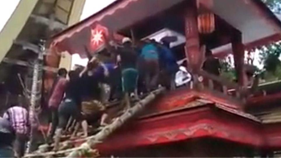 Τραγικό θάνατο βρήκε ένας Ινδονήσιος στην κηδεία της μητέρας του, όταν το φέρετρο της έπεσε από τα χέρια των ανθρώπων που προσπαθούσαν να τον ανεβάσουν σε έναν ξύλινο πύργο, όπως προστάζει το έθιμο, με αποτέλεσμα να «προσγειωθεί» πανω του προκαλώντας του θανάσιμες κακώσεις στο κεφάλι.